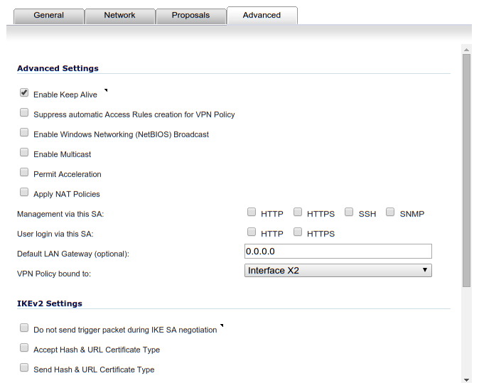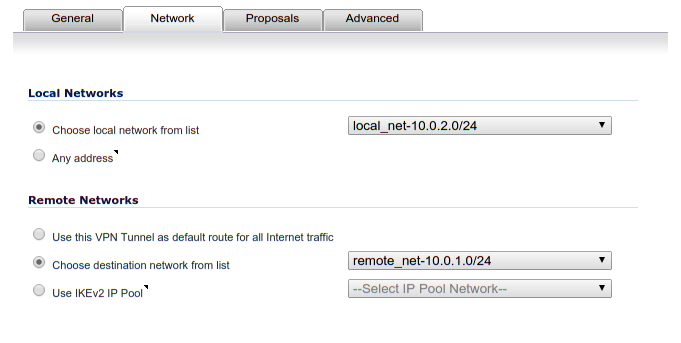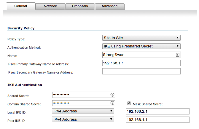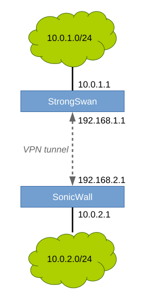 conn sonicwall # This server left=192.168.1.1 leftid=192.168.1.1 # The network behind this server leftsourceip=10.0.1.1 leftsubnet=10.0.1.0/24 # The remote SonicWall right=192.168.2.1 rightid=192.168.2.1 # The network behind remote SonicWall rightsubnet=10.0.2.0/24 # Connection parameters keyexchange=ikev2 authby=psk ike=aes256-sha1-modp2048 esp=aes256-sha1-modp2048 auto=start