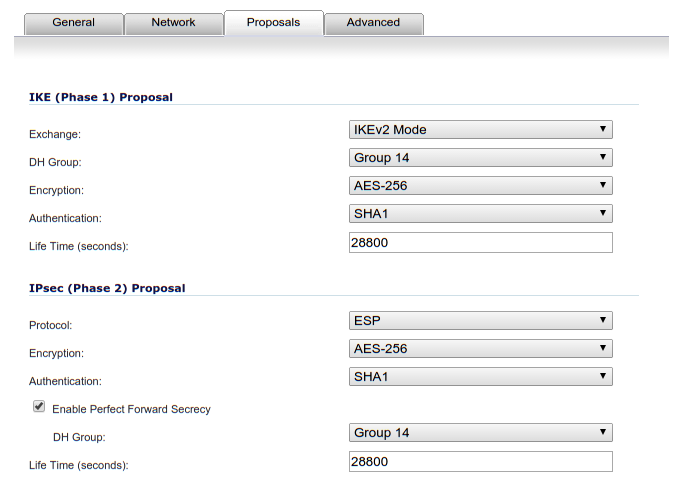 We use IKEv2 for key exchange, with AES-256 for encryption and SHA-1 for hashing. A 2048-bit key means Diffie-Hellman group 14. Authentication is done using a pre-shared key. The connection will be started automatically at start.